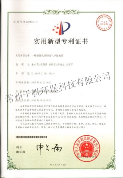 實(shí)用新型專利證書 一種整體化油煙廢氣凈化裝置