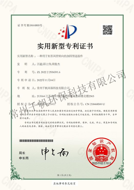 實(shí)用新型專利證書 一種用于矩形風(fēng)管轉(zhuǎn)向的加固型連接件
